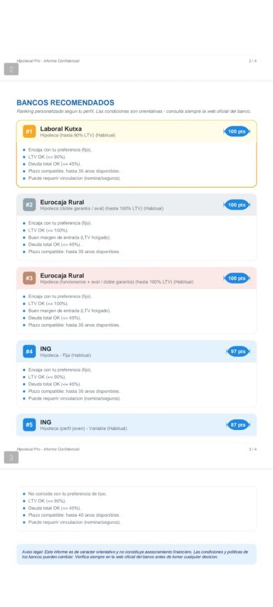 Hipotecal Pro analiza tu perfil financiero y te recomienda las entidades más adecuadas según tu situación real.